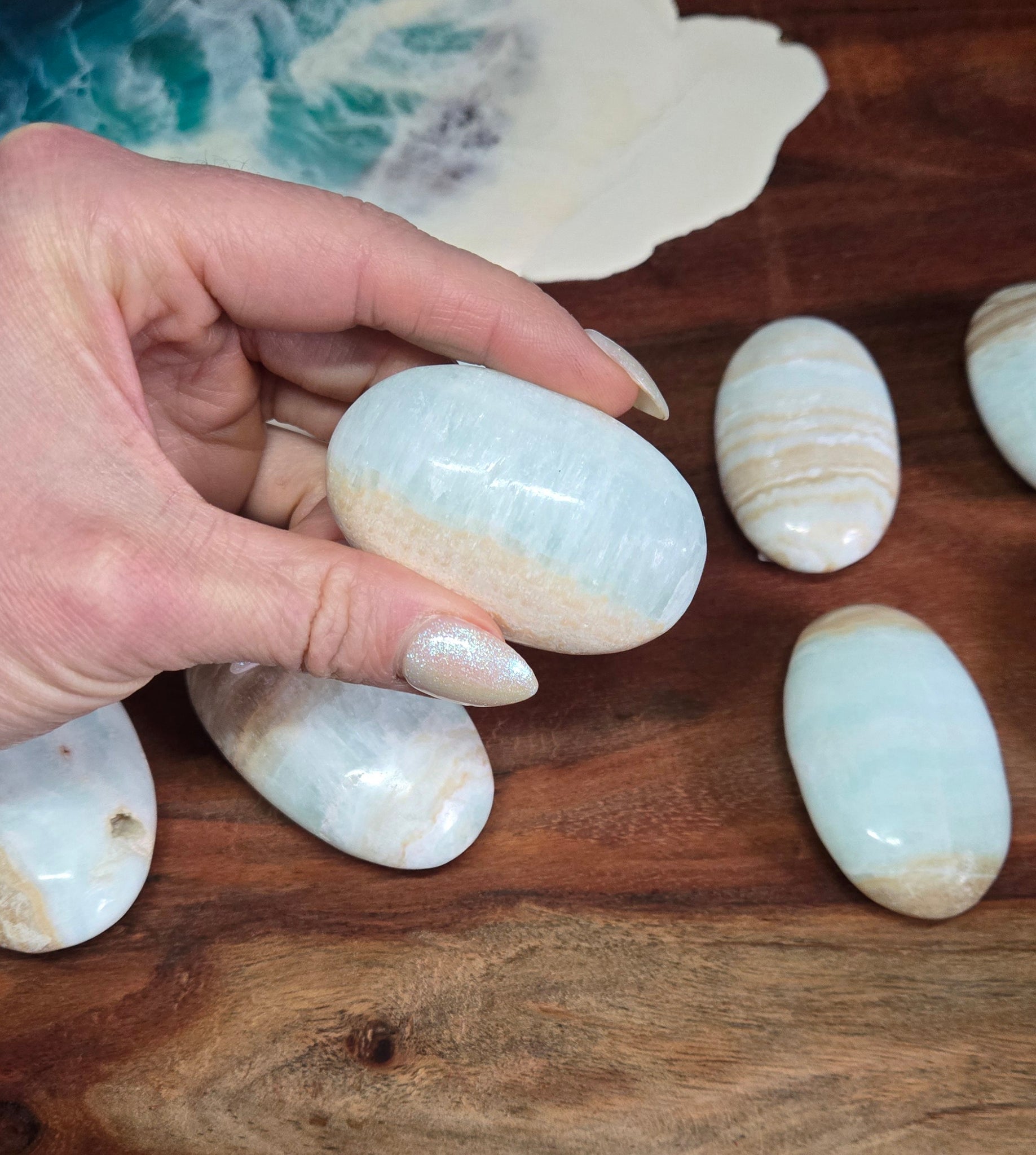 Caribbean Calcite is a very new combination mineral that was recently found in 2019 in Pakistan. It's a combination of a very light ocean Blue Calcite and light brown and white Aragonite. Caribbean Calcite is a onetime find and could be mined to extinction within a few years.